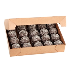 Flødebolleskum på vaffelbund overtrukket med mørk chokolade og drysset med kokos.