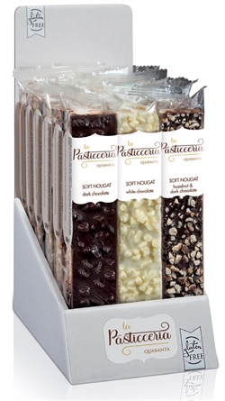 Indhold: Sukker, hasselnødder (35%), honning, glukosesirup, majsstivelse, kakaocreme (sukker, veg.fedt, fedtfattig kakaopulver, kakaopulver, emulgator (soja lecithin), vanilje), kakaopulver, hasselnøddepasta (3%), mørk chokolade (sukker, kakaopasta, kakaosmør, emulgator (sojalecitin), vanilje), veg. olie, æggehvide, vafler (kartoffelmel, vand, veg. olie), krydderier. Glutenfri. Kan indeholde spor af peanuts, sesam, æg, soja, mælk.