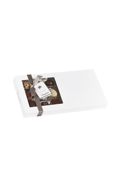 PRALINE: Hvid chokolade, praline og marcipan LÆSØ: Mælkechokolade, karamel og seasalt PROVENCE: Mørk chokolade, orange og marcipan LIQUORICE: Amber hokolade. lakrids og karamel MINT: Mørk chokolade, karamel og mint BLACKCURRANT: Mørk chokolade, solbær og ganache FLEUR D'ORANGE: Hvid chokolade, praline og orange VALENCIA: Mørk chokolade og marcipan 200 gram - 18 stykker - 9 forskellige varianter.