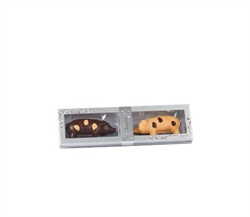 To klassiske julegrise af marcipan på spanske mandler, henholdsvis overtrukket med et tykt lag mørk chokolade Peru 61 % og vores prisvindende hvide chokolade, White.